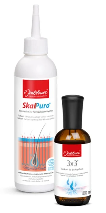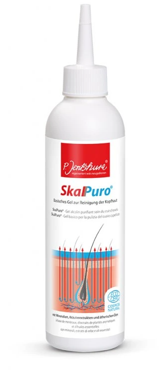 Vlasový gel SkalPuro s pH 8,5 pro zásadité hluboké čištění pokožky hlavy obsahuje minerály, éterické oleje a bylinné výtažky – včetně březové kůry a kopřivy. „Podporuje prokrvení, urychluje odstraňování rozpuštěných škodlivých látek a podporuje a posiluje růst vlasů a dodává vlasům výrazně větší objem a pružnost,“ vysvětluje Peter Jentschura. SkalPuro je certifikovaný přírodní kosmetický produkt, který získal pečeť dermatestu „excellent“.