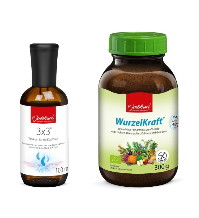 Pro podporu růstu vlasů je třeba také dodávat tělu správné živiny díky stravě bohaté na zásadotvorné látky a vlasovou pokožku remineralizovat. Optimální je využít rostlinný granulát WurzelKraft vytvořený Dr. Jentschurou. Je to omnimolekulární biopotravina s květovým pylem, která obsahuje všechny minerály, stopové prvky a vitamíny, které se nacházejí v přírodě. Naše tělo si samo vybere to, co mu právě chybí a doplní to tam, kde je právě potřeba. Výsledkem je zdravá pokožka hlavy s mnoha silnými a lesklými vlasy.