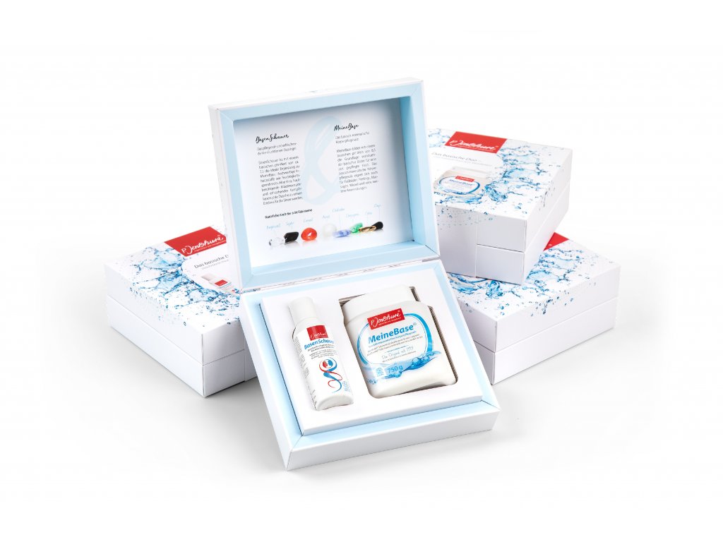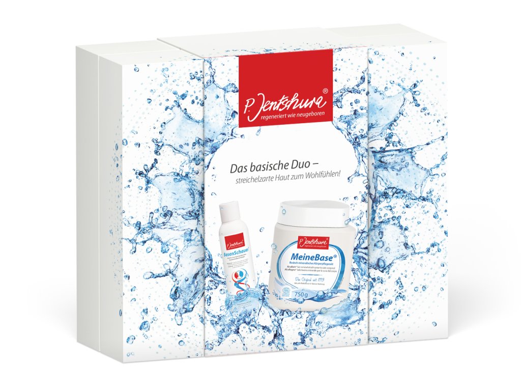 Dárkový set „Zásadité DUO“ obsahuje zásadito-minerální koupelovou sůl MeineBase® 750 g a zásaditý sprchový gel BasenSchauer® 100 ml.